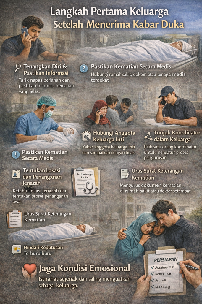 Langkah pertama keluarga setelah menerima kabar duka memang terasa berat dan membingungkan. Namun, dengan tetap tenang, memastikan informasi kematian, melibatkan keluarga inti, serta membagi peran sejak awal, keluarga dapat menjalani proses ini dengan lebih terarah.