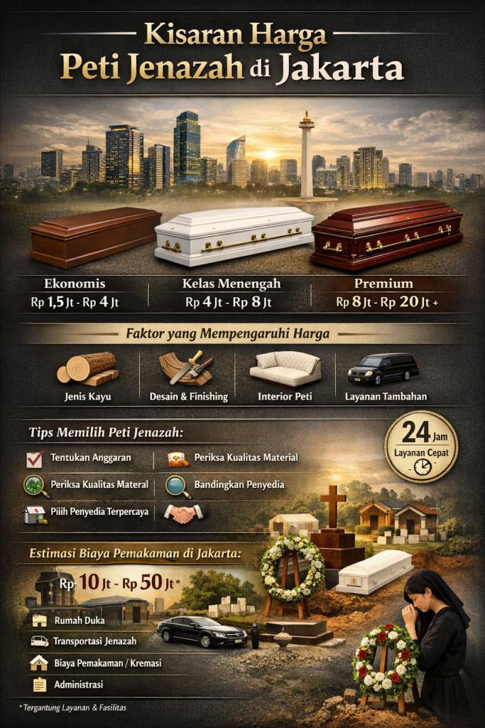 Memilih peti jenazah adalah salah satu kebutuhan penting ketika keluarga menghadapi momen duka. Di Jakarta, sebagai kota metropolitan dengan berbagai pilihan layanan pemakaman, kisaran harga peti jenazah sangat bervariasi tergantung pada bahan, desain, hingga layanan tambahan yang disertakan. Artikel ini akan membahas secara lengkap kisaran harga peti jenazah di Jakarta, faktor yang memengaruhi harga, serta tips memilih peti jenazah yang sesuai kebutuhan dan anggaran.
